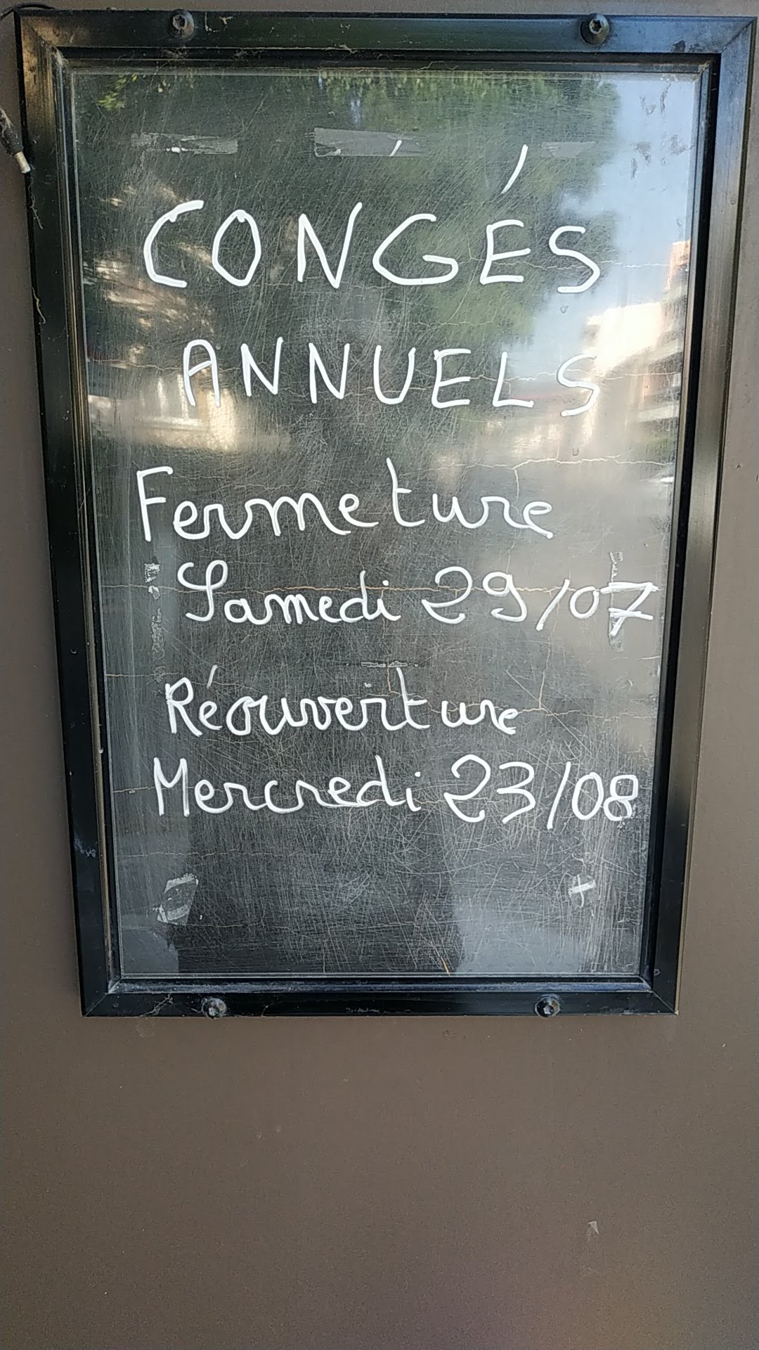 Fermé en plein mois d'août, du 27 juillet au 23 août, quasi 1 mois, Merci pour les touristes qui veulent acheter et marchent en pleine chaleur pour trouver rideau baissé